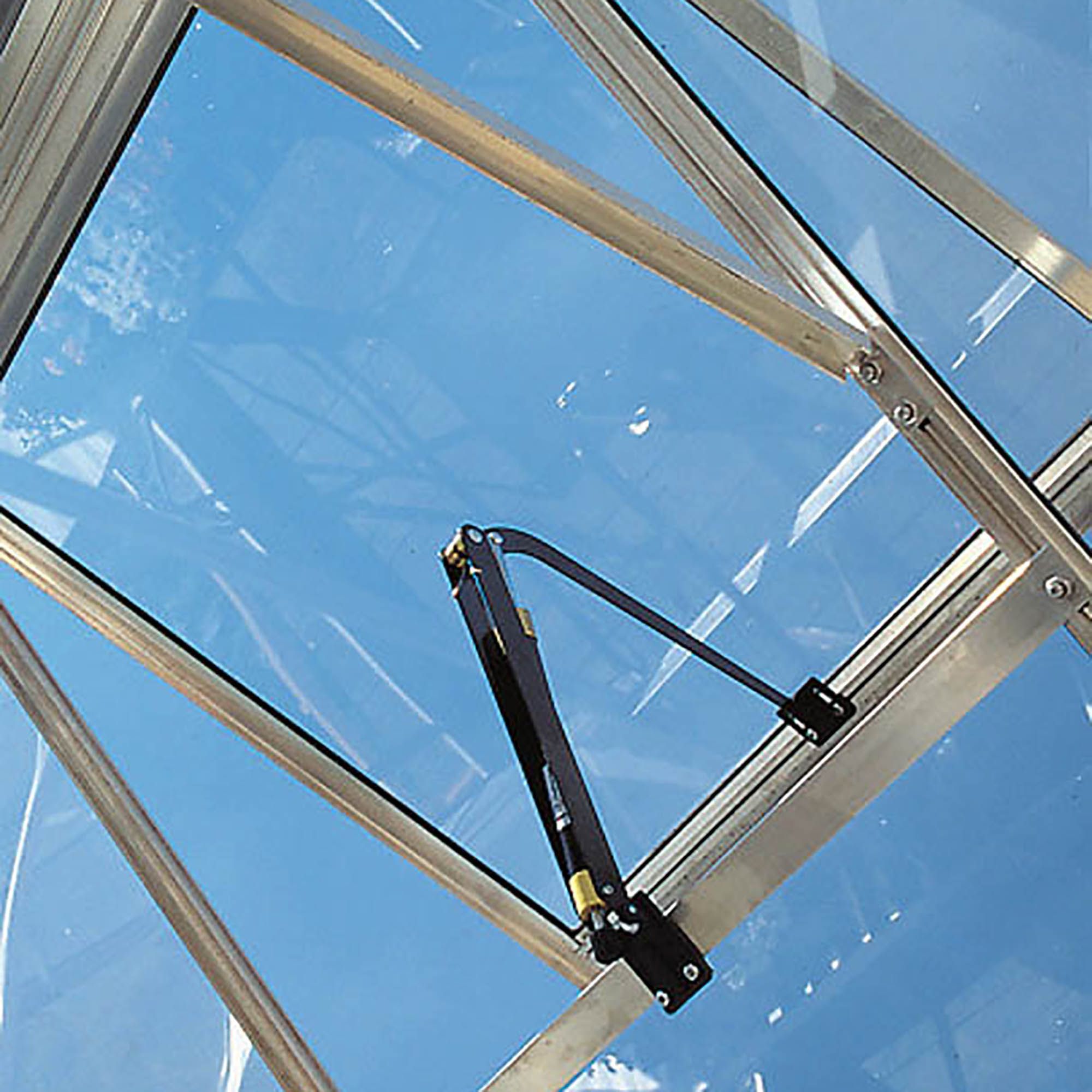 Automatically opens and closes the roof vent window when temperature changes. When the arm is pushed by the piston, it in turn pushes the window open. Place the opener in the centre of a window vent and mark the position of the holes on the window frame and greenhouse frame.